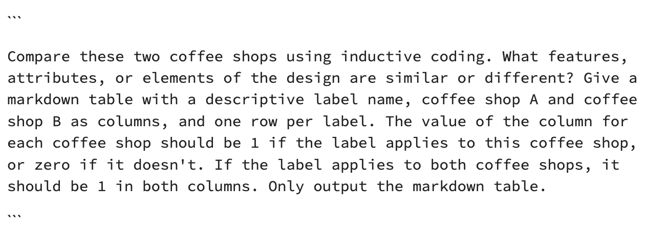 Do this enough times for different pairings, and you’ll get a database of labels—also called codes or memes—that you can use for deductive coding, or finding what other samples from your database share these attributes (i.e., how many coffee shops have exposed brick?). This is boring, manual work, especially when you have hundreds or thousands of samples to sift through. Thankfully, since ChatGPT was upgraded to “see” images—called GPT-4V for developers, and the “v” is for vision—)—AI can help automate this process: